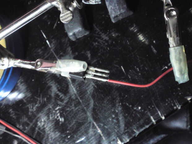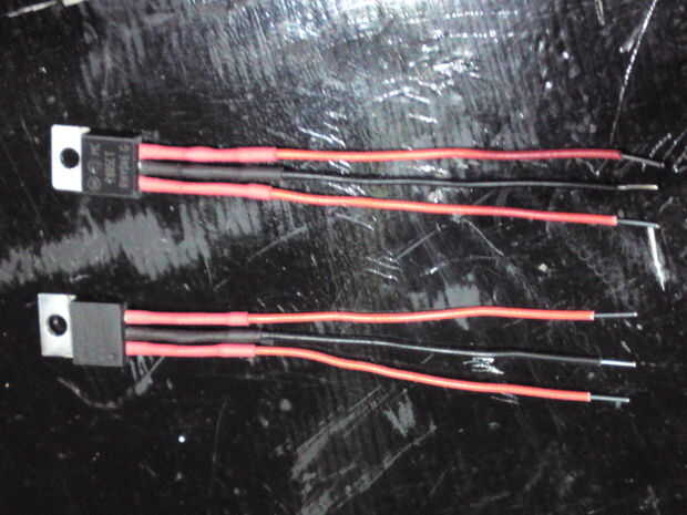 Las fotos de abajo muestran el proceso de soldar los cables a las patas de los reguladores de tensión y uso cables rojos para la entrada y salida de la pierna y el cable negro de la pierna de tierra: