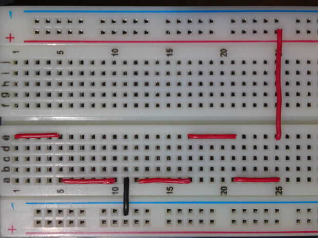 A continuación, la imagen izquierda de abajo es donde esta página del instructable terminado y la imagen de la derecha está el enlace de cable rojo positivo en su lugar conectar los carriles de alimentación superior e inferior (muchas gracias por la abqlewis de captura!)
