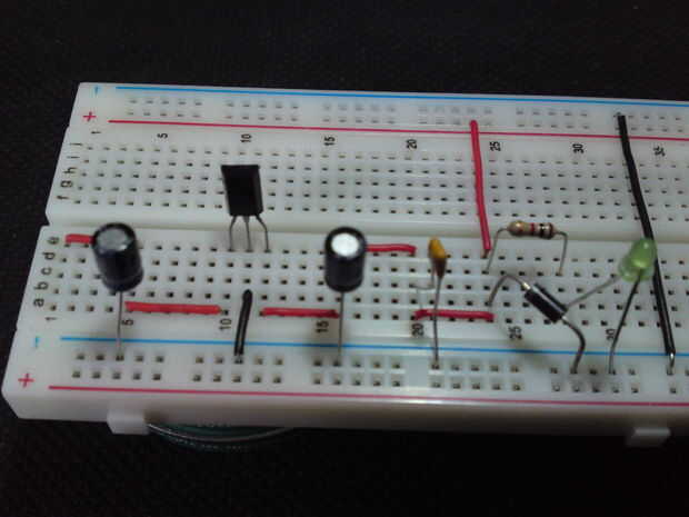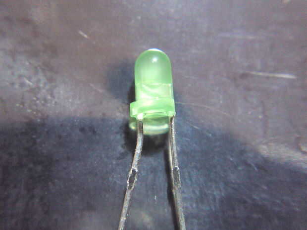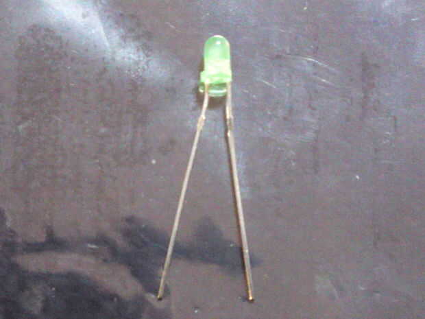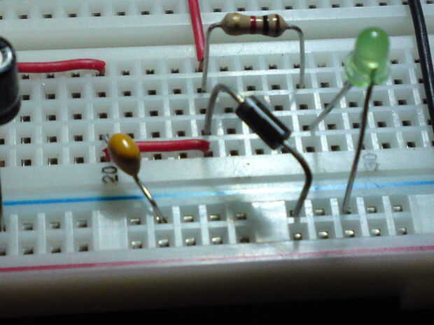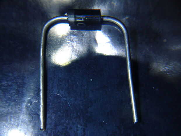 Agarra el diodo 1N4004 y curva como se muestra en el cuadro pequeño abajo (Foto 9) pero prestar  especial atención a la raya gris y qué lado su en!!! Esto es añadido para protección reversa de la polaridad! También tomar una 1K resistencia (colores: marrón, negro, rojo, oro) y doblarla como se muestra en el cuadro pequeño 2 º a continuación (cuadro 10) y agarra el LED verde y observar de cerca tiene una muesca plana en un lado como se muestra en el cuadro pequeño 3 º a continuación (cuadro 11), este es el lado del cátodo o menos (-) lado (negativo) y la pata más larga es ellado del ánodo más (+) , esto como se muestra en la imagen pequeña 4 º por debajo de la curva (cuadro 12)... (Ahora si quiere mantener el recuento de piezas tan bajos como sea posible te puede elegir no utilizar la resistencia K LED o 1 en este paso)