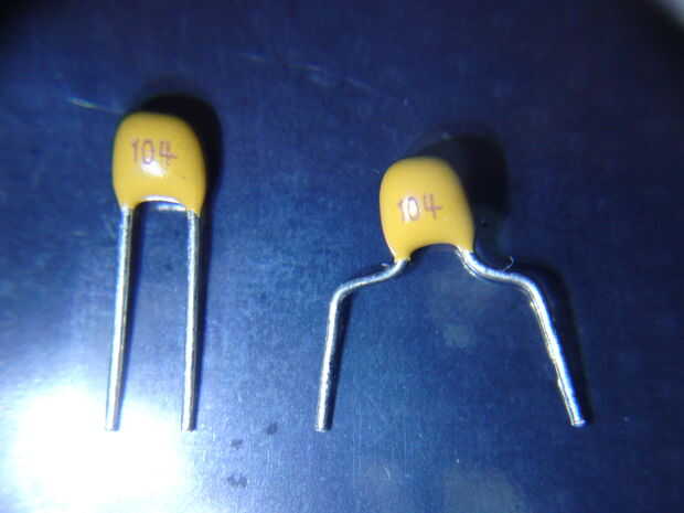A continuación, doblar sola de la 0.1uF (100nF) condensadores como se muestra en el cuadro pequeño abajo-izquierda (cuadro 7) e insertarlo en cualquier forma en los orificios se muestra en el cuadro 2 abajo-derecha (imagen 8) que le guste pero... Cuando un componente puede ser insertado cualquier manera siempre prefiero tener el lado que tiene la muestra de escritura en y frente a mí, que es solamente debido a sus preferencias personales, su completamente hasta que usted!