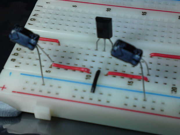 Se necesita: Condensadores electrolíticos 47uF y el 5v regulador de voltaje {Im mostrando la inserción del regulador de voltaje de baja potencia del primero (el KIA78L05) y éste es el tipo de pequeño a-92 } se muestra a continuación (cuadro 5), Observe con cuidado las patas del condensador va en los agujeros correctos, los pierna más corta es el negativo (-) y debe encajar en el riel de alimentación negativo (-) en el protoboard! En cuanto al regulador de 5v Asegúrese de que la parte redondeada quede frente a usted y el lado plano no quede frente a usted, como se muestra en vista la imagen desde arriba! La imagen Below_RIGHT (cuadro 6) muestra las piezas instaladas desde un ángulo para ver mejor que los agujeros se insertaron en las piernas...