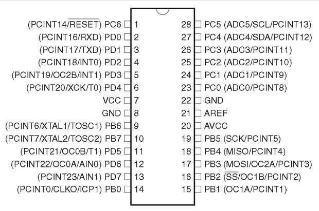 También había copiado directamente de la hoja de datos de ATMEL para mostrar las conexiones exactas pin del microcontrolador y también una imagen de internet que muestra claramente lo que perno conexiones el Arduino corresponde con las conexiones de pines en el Chip ATMEGA328 real delP-PU ! También el ATMEGA168 tiene las mismas conexiones de perno como el ATMEGA328 sólo para su información!