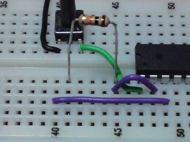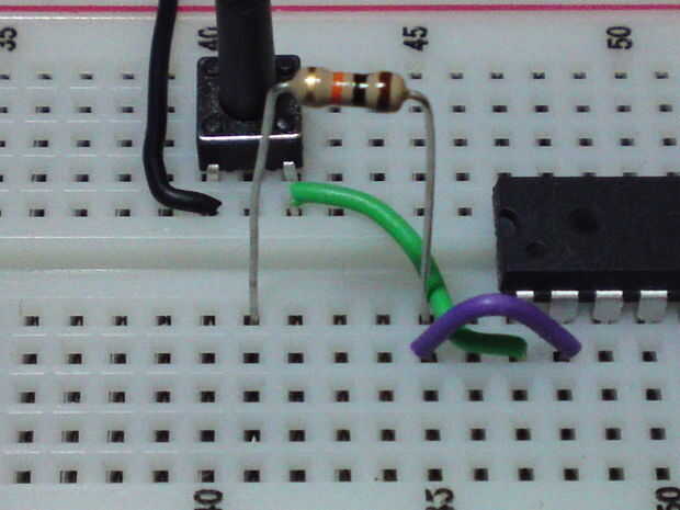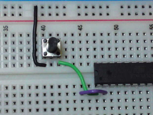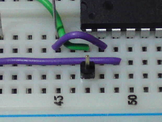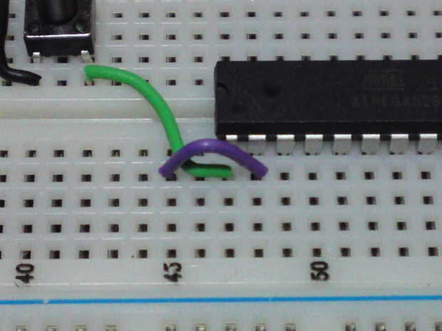 Para instalar el Interruptor táctil (que se utiliza para restablecer el Arduino protoboard o iniciar el "Manual de Reset para subir bocetos" que cubriré en la última sección de esta guía!), mire la imagen de arriba a la izquierda abajo (cuadro 15) comenzar con colocar un enlace de cable verde como entonces, y luego mira en la parte superior derecha del cuadro (cuadro 16) doblar un cable morado enlace como se indica - esto hace más fácil de colocar en los agujeros sin interferir con cualquier otros cables, coloque el interruptor como se muestra en la imagen inferior izquierda (imagen 17) luego inserte el doblado alambre púrpura-enlace en la imagen inferior derecha (cuadro 18) ! {El enlace cable verde se inserta por primera vez en el pin 1 del Chip ATMEGA y el enlace de alambre doblado púrpura se inserta en el PIN2 del Chip ATMEGA que es el pin de "RX" utilizado para subir bocetos a Arduino}
