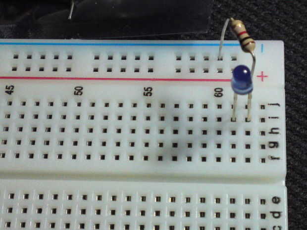A continuación, tome el LED azul e insertar como se muestra en cuadro 4 y Doble seguro puedes ver exactamente qué lado la 'muesca plana' es el que puede ver en la imagen siguiente (cuadro 4) y en caso de que usted puede ver bastante claro - fijamos a la derecha del LED abajo, que es el signo menos (-) pierna por lo que es la pierna que conecta el Resistor de 1 K :(Ahora si usted quiere hacer esto para tener un conteo de piezas de baja puede elegir no usar el LED azul y su Resisotr K 1 pero estos dos componentes se utilizan para probar la Breduino con el Sketch de 'Blink', pero completamente su opción! jajaja)