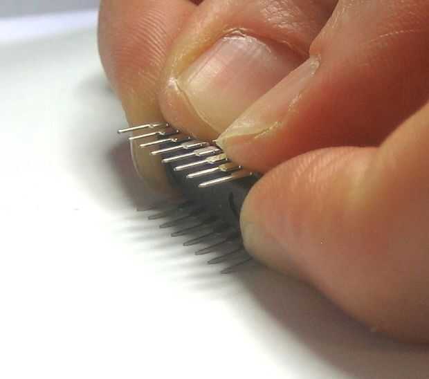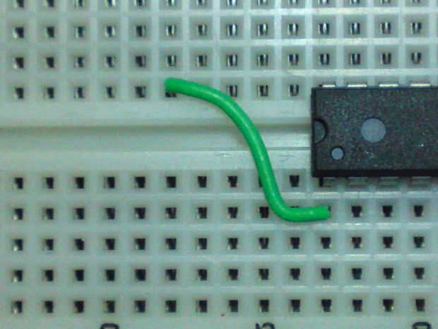Tomar el chip su especial Antiestático IC tubo, estos microcontroladores generalmente vienen de fábrica con sus pernos ligeramente 'ubicados' - lo que esto significa es que los pasadores de costumbre línea hasta totalmente con los agujeros en la placa o en un zócalo del IC va a necesitar doblar ligeramente y suavemente para que apunten hacia abajo o ligeramente hacia adentro para tener un buen ajuste en el protoboard y una manera de hacerlo exactamente como en la imagen siguiente: