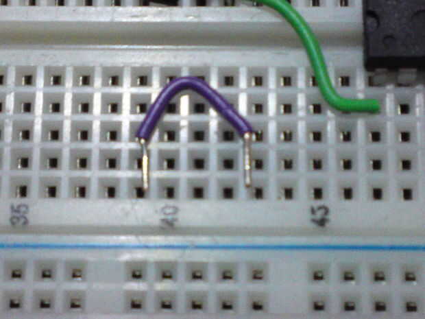 Llegado el momento de agregar mi enlace de alambre - Nota que el enlace de alambre desde el lado positivo del LED (+), mira en la imagen abajo con cuidado (Foto 5) y el aviso que su sesión en el agujero justo sobre el (ánodo, +) lado positivo del LED y hay exactamente cuatro agujeros que este cable enlace salta antes de entrar en el 5 º agujero - este es VITAL que se mantiene correcta!!! (Se trata de 19 pines en el Chip ATMEGA también conocido como Pin13 de un Arduino, por favor referirse a la ' Pin asignación de fotografía ' al final de la lista de imágenes o al principio de la sección 2, esta sección!)