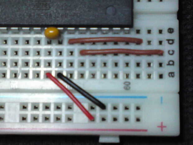 OK ahora agarrar la última 0.1pF (100nF) condensador de cerámica y lugar como se muestra en el cuadro 7 (en los agujeros donde el PIN 7 y PIN8 son en el Chip ATMEGA!) junto con los dos cables de alimentación también como se muestra (Cable rojo al PIN7!) y Cable negro a PIN8 del Chip ATMEGA