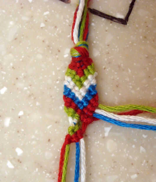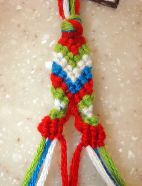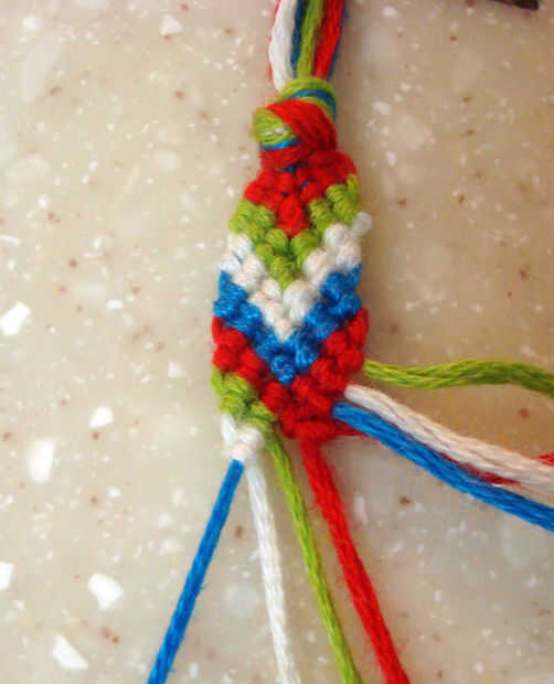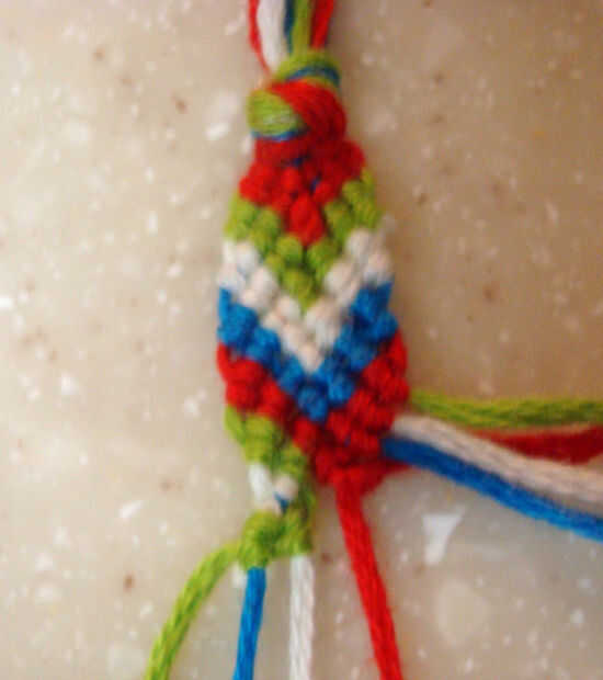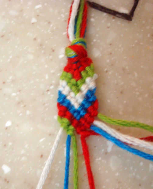 5. usando la misma cadena rojo otra vez, atar nudos básicos en verde, azul y blanco, va en la dirección contraria y dejar rojo como último en la orden otra vez.