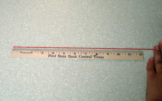 No tengo una cinta métrica, así que utilicé una regla de 12 pulgadas, que funciona igual de bien. I había medido 12 pulgadas, llevó a cabo la cuerda en la marca de 12 pulgadas y luego se trasladó la regla hacia abajo a otro miden 12 pulgadas a partir donde sostenía la cadena. Entonces sostenga la cadena en la nueva marca de 12 pulgadas y bajar la regla que mida 8 pulgadas. Cortar la cadena aquí y tendrá 32 pulgadas!