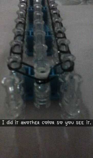 Esta es la pulsera como se verá cuando esté terminado. Yo recomiendo usar 3 colores diferentes para esta pulsera. Antes de poner las bandas en el paso siguiente Asegúrese de que doble todas las bandas, si crees que me refiero a hacer una banda de la