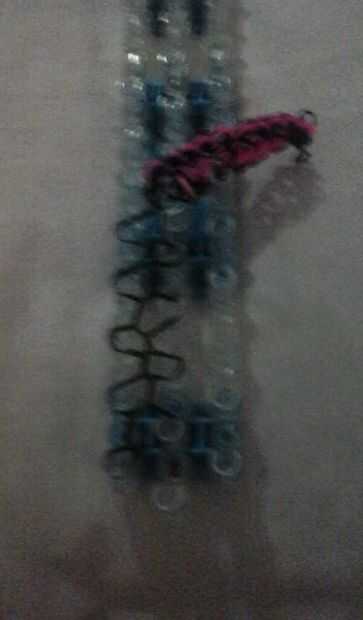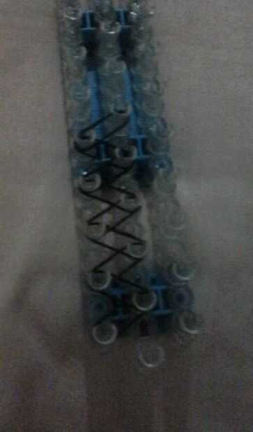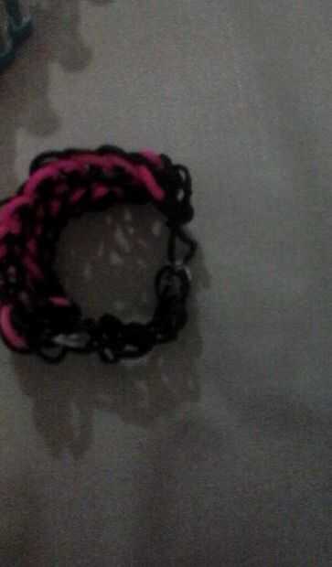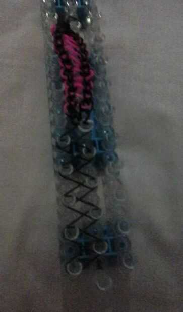 Esta es la pulsera como se verá cuando esté terminado. Yo recomiendo usar 3 colores diferentes para esta pulsera. Antes de poner las bandas en el paso siguiente Asegúrese de que doble todas las bandas, si crees que me refiero a hacer una banda de la