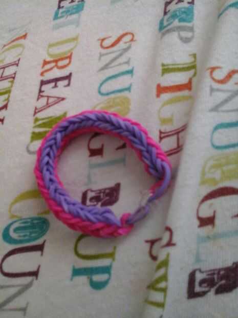Esta es la pulsera como se verá cuando esté terminado. Yo recomiendo usar 3 colores diferentes para esta pulsera. Antes de poner las bandas en el paso siguiente Asegúrese de que doble todas las bandas, si crees que me refiero a hacer una banda de la