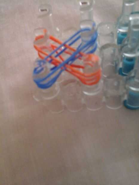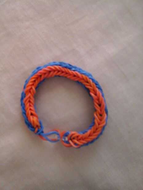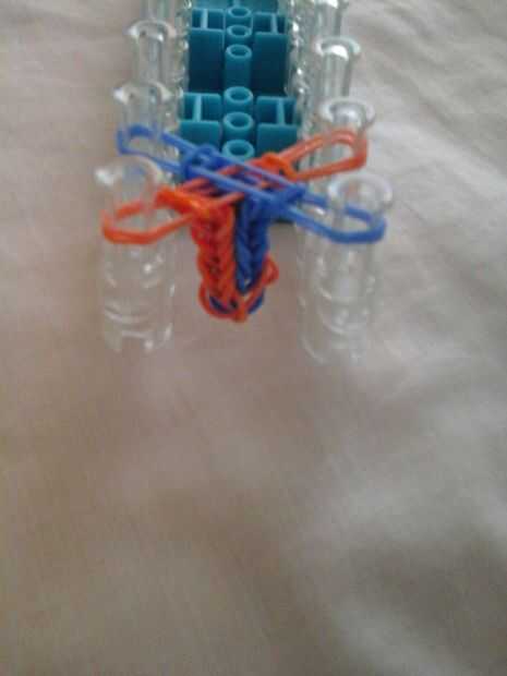 Esta es la pulsera como se verá cuando esté terminado. Yo recomiendo usar 3 colores diferentes para esta pulsera. Antes de poner las bandas en el paso siguiente Asegúrese de que doble todas las bandas, si crees que me refiero a hacer una banda de la