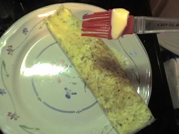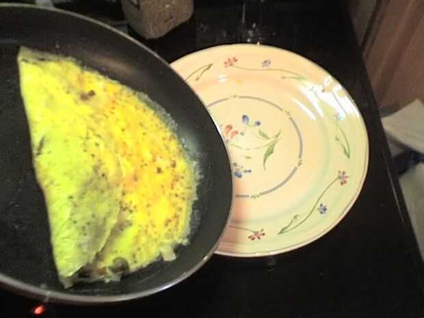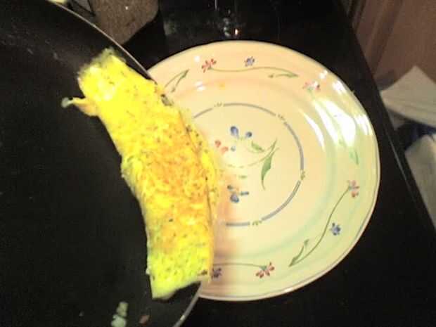 Después de la inclinación de la cacerola, flip a la tortilla una vez y deslícelo sobre la placa. Si se pega a la olla probablemente no utiliza suficiente mantequilla o el pan no estaba lo suficientemente caliente como al principio.