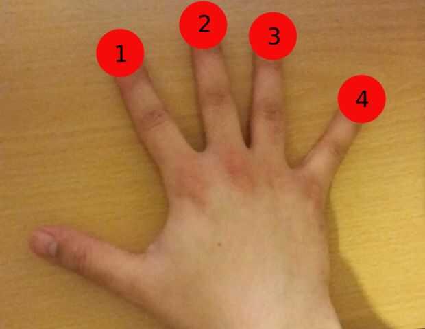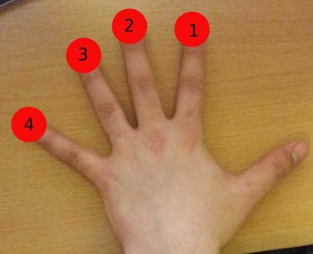 • Los dedos se numeran de índice a meñique con '1' correspondiente al dedo índice y '4' correspondiente a su pinky.