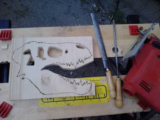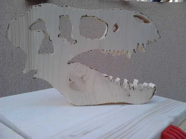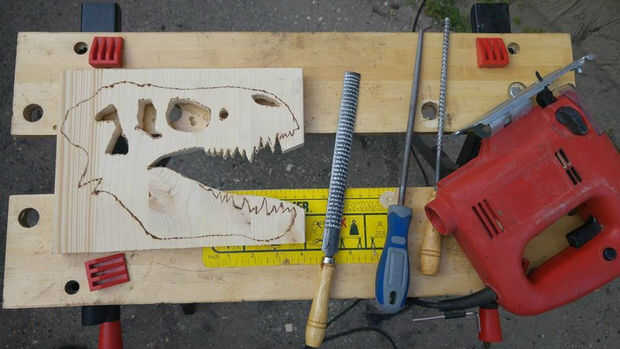Hice un cuadro cada pasos. Así que como veis redondo cortar la plantilla con la sierra caladora orbital y lo usado para los dientes (que fue una parte difícil). Para los agujeros utilicé el taladro y el archivo de madera redondeado y plano. Para las espinas de madera utilicé el papel de lija.