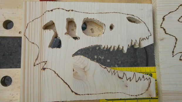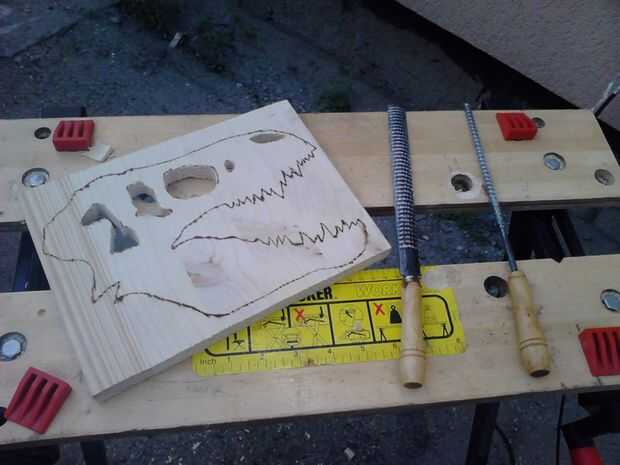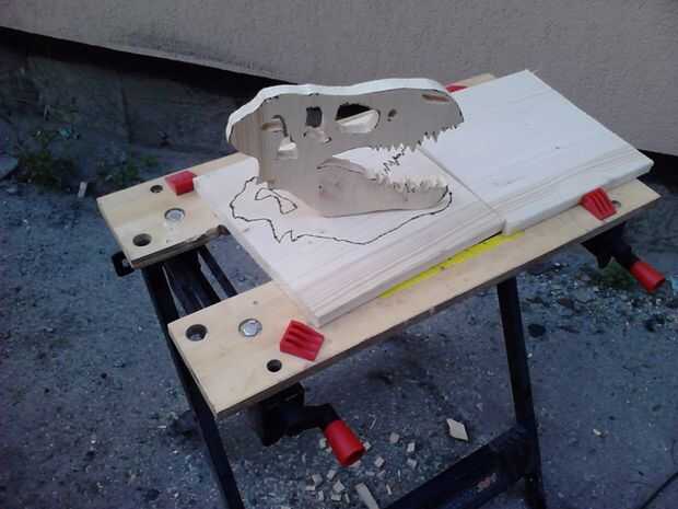 Después el cráneo me hade para hacer la caja para el fundamento. Cortar la madera con la sierra caladora orbital y una madera de mano Sierra porque es mucho más débil que la Junta Directiva. Y también necesitaba para hacer un soporte para el verso de la calavera. (Se puede ver en el cuadro 7 que dibujar una plantilla de repuesto en la otra mitad de la Junta para el caso si echan a perder éste. Pero no lo hice:))