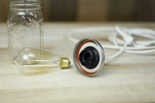 Impulsar la toma de luz a través del orificio hecho en la tapa. (Asegúrese de incluir también el borde). Luego atornille el anillo que viene con la lámpara colgante.