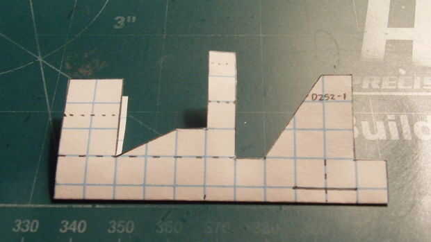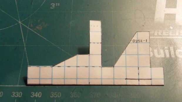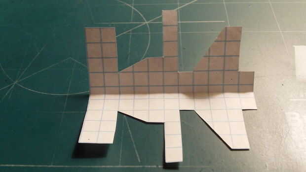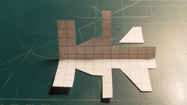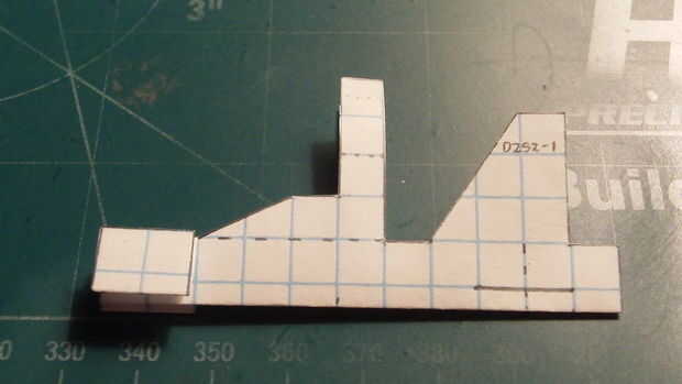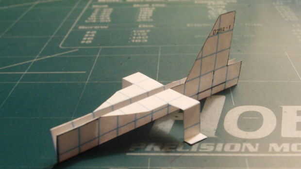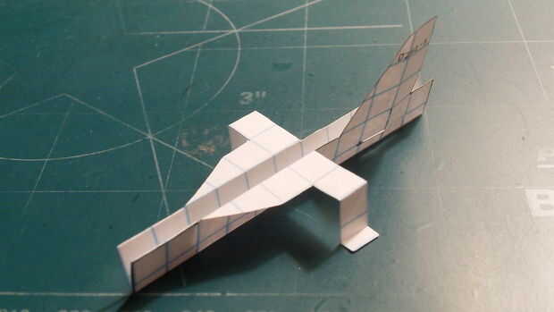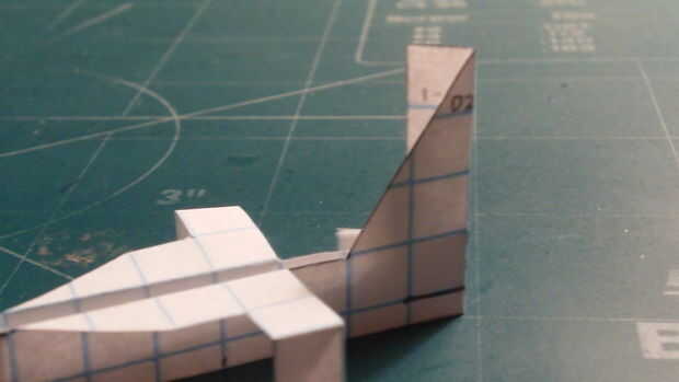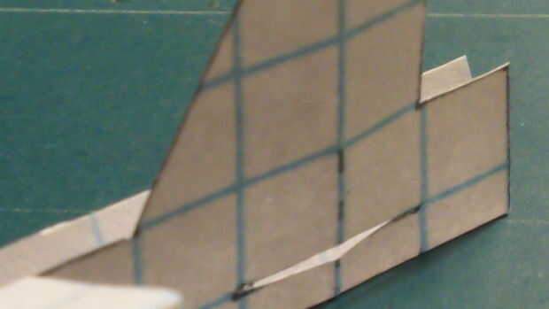 Corte y desplegar el fuselaje y cortar el estabilizador vertical derecha. Entonces restaurar el pliegue. Doblar el contrapeso en sí mismo, como se muestra. Luego doblar el fuselaje hacia adelante en la línea vertical debajo del estabilizador vertical. Una vez haya hecho el corte a lo largo de la línea marcada, se despliegan. Aplique cinta donde señalado y cortar cualquier exceso.