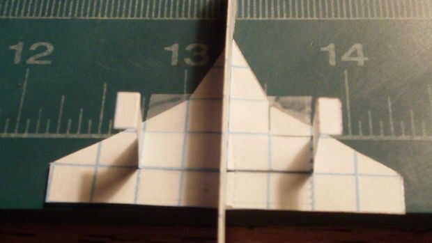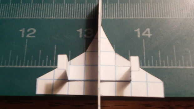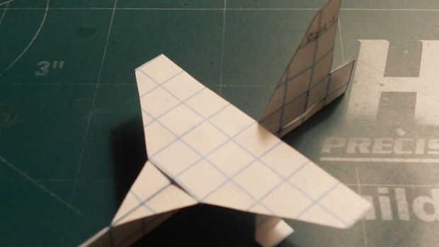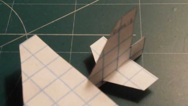 Una vez que ha terminado con las alas, cortar sus estabilizadores horizontales y deslícelos a través de la abertura en el fuselaje que formuló. Cuando a través, doble hacia arriba y aplique la cinta en la parte inferior; luego doble hacia abajo. Esto habrá completado su avión.