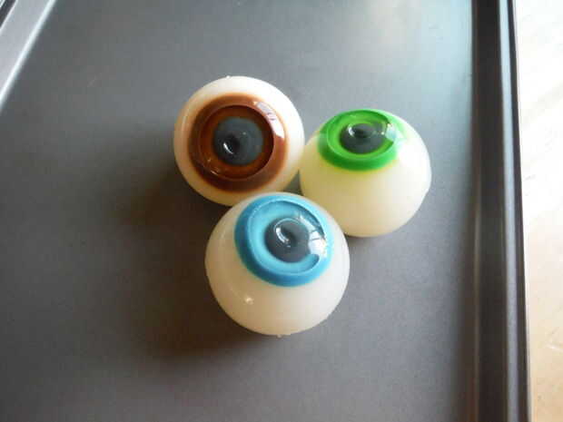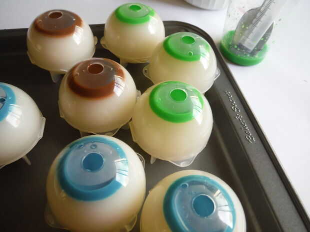 La parte principal de la blanco de los globos oculares se hace mezclando una cucharadita o dos de la gelatina blanca de leche a 2 tazas enteras de la gelatina transparente! Le da el realismo de un ojo que una gelatina blanca pura o pura gelatina clara no podía dar por cuenta propia.