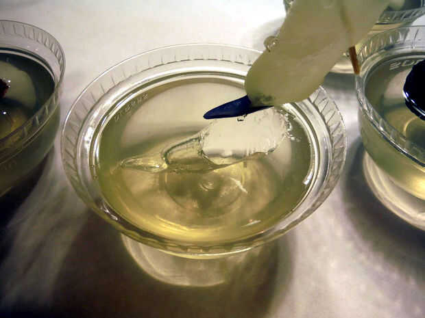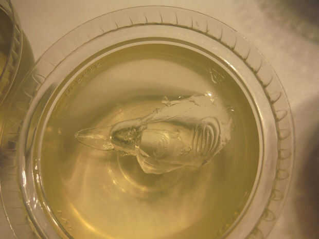 Cuidadosamente--cuidadosamente--desplazar el dedo plástico de la gelatina fría, ponga. Me parece que la punta de la aguja de 18 calibre, comprada específicamente para este proyecto, funciona muy bien para correr alrededor del borde del juguete y la gelatina para aflojar la succión.