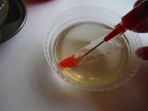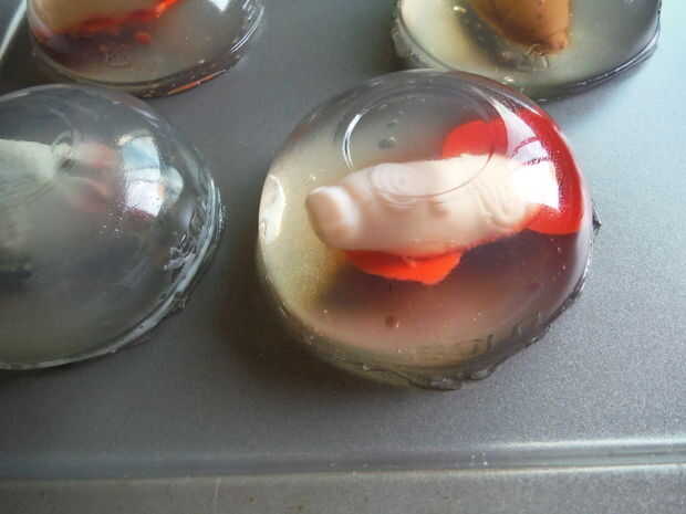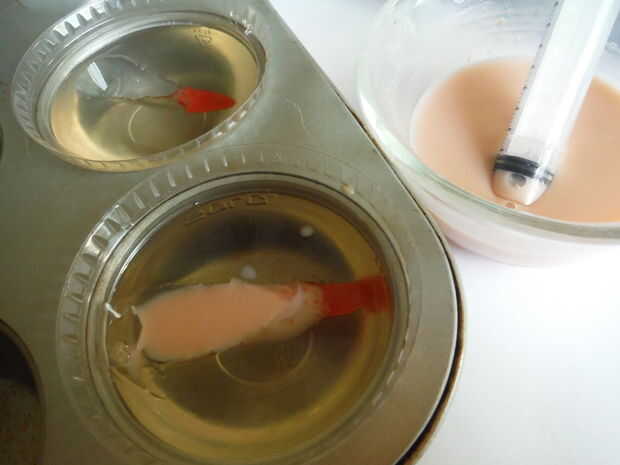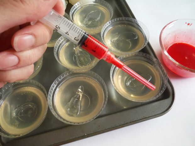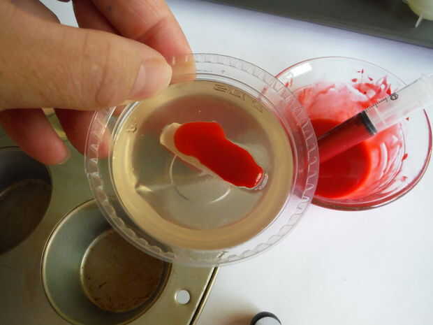 Puede utilizar una jeringa limpia, o lavar apenas utilizado, ahora chupar el color carnoso y gotear la gelatina de leche en el resto del molde de dedo (no es necesario la aguja en el extremo). Después de que han dejado la firma de la gelatina de leche hasta en el refrigerador por unos minutos, puede gotear la gelatina de color sangre en la parte inferior de los dedos para cubrir los bordes irregulares en el molde. Nuevamente a la nevera para establecer.