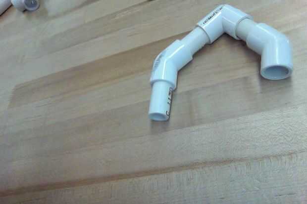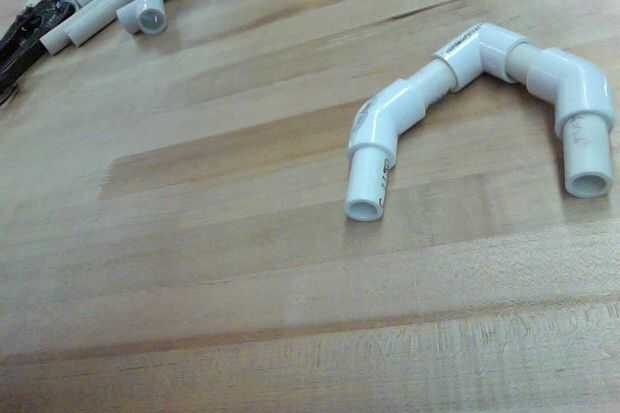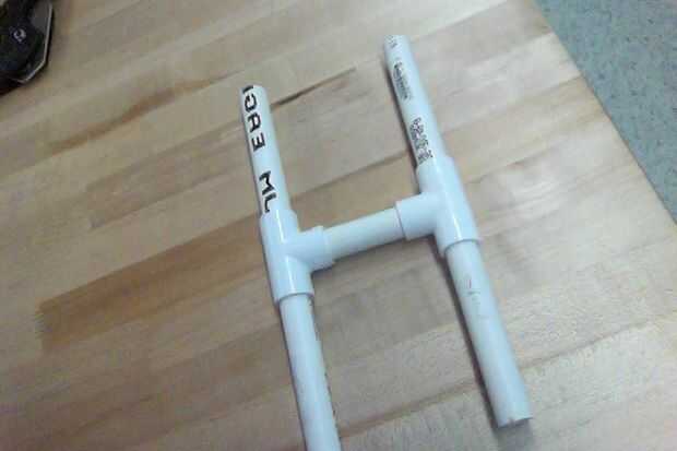 H: Una vez que se conectan todas las piezas de cuatro 5 pulgadas, el diseño final debería verse tan claramente como una H como puede ser. Ahora se hace su trabajo, han hecho la letra H con tuberías de PVC y accesorios.