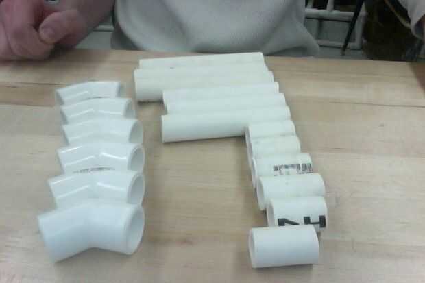 Llama a este pequeño proyecto para tres secciones de 4 pulgadas, tres 5 secciones, y seis secciones de 1 pulgada de PVC de media pulgada de la pipa, así que al final usted tendrá 12 secciones de tubería de PVC con un total a 33 pulgadas. Este proyecto también requiere seis codos de 45 grados y dos conexiones de T.