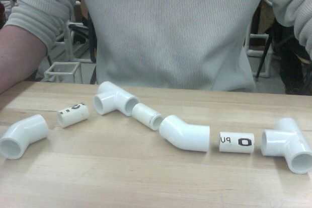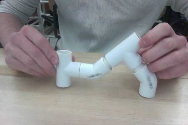 Usted se toma su T fitting e insertar una sección de una pulgada en la salida, luego conecte un codo de 45 grados a la sección de una pulgada, luego conecte eso codo de 45 grados a la otra T con una sección de una pulgada primero Conecte un codo de 45 grados a la salida de lado de eso T con su última sección de una pulgada. Debe verse así.