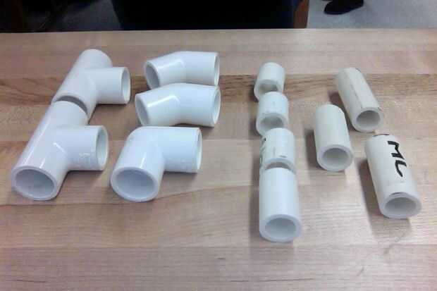 Materiales: -Dos conectores Tee -Dos codos de 45 grados -Un codo de 90 grados -Cuatro tubos de PVC de 1 pulgada -Un tubo de PVC de 2 pulgadas -Dos tubos de PVC de 3 pulgadas