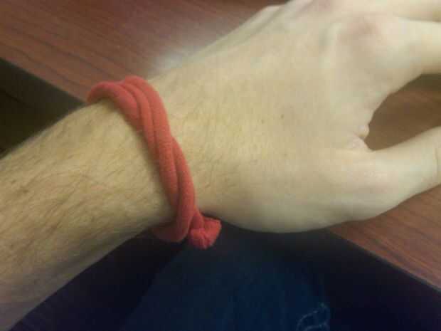 Plaza nudo: un nudo cuadrado trabaja bien para mantener la banda unida. Probablemente necesita envolver la venda dos veces alrededor de su muñeca para conseguir que se ajuste. Un nudo cuadrado le permite cortar los extremos también.