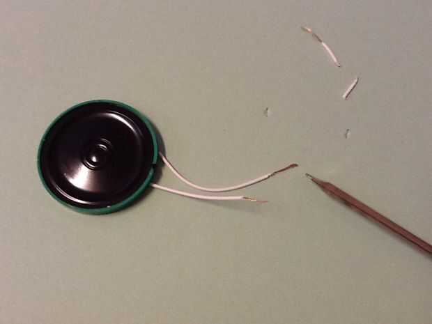 Una vez que haya quitado el altavoz y el circuito, utilice el destornillador de cabeza plana para quitar los cables de los circuitos, pero no quitar los cables de los altavoces (véase el cuadro). Ahora tienes un altavoz con dos cables aislados. Una vez más, utilice el destornillador para pisar los cables y quitar el aislante. Se pueden utilizar otras formas de aislamiento por favor. Extraiga aproximadamente un cuarto de pulgada del aislamiento.