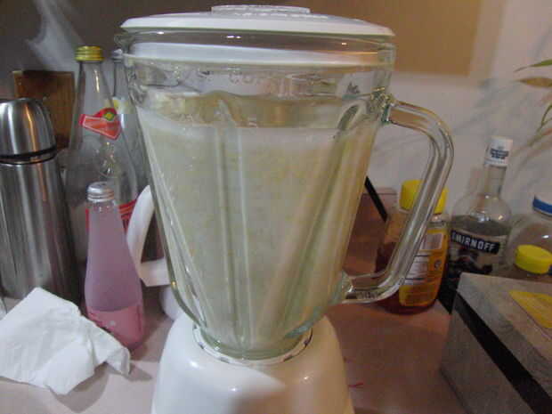 Vierta el agua se remojo la soja en la licuadora. Luego Vierta la soya en la licuadora. Agregue cuatro tazas de agua y mezcla hasta que quede suave.