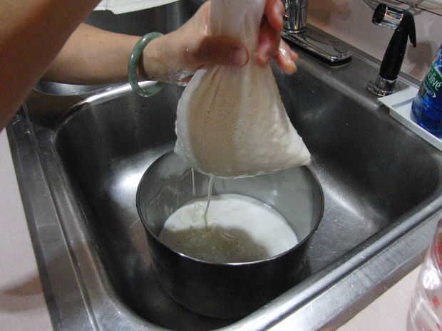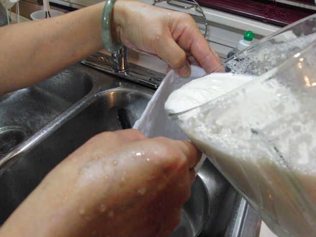 Luego Vierta la mezcla de soja en la estopilla y mantenga sobre el bote. Exprimir tanto líquido como sea posible. Después, vierta la pulpa de soja sobrante en la licuadora y agregar 3 tazas más de agua y mezcla hasta que quede suave. Repita el filtrar la mezcla a través de la estopilla. Verter la pulpa en la licuadora nuevamente y añadir 2 tazas más de agua (esto lleva a 11 tazas total). Cuele la mezcla otra vez.