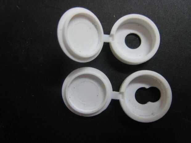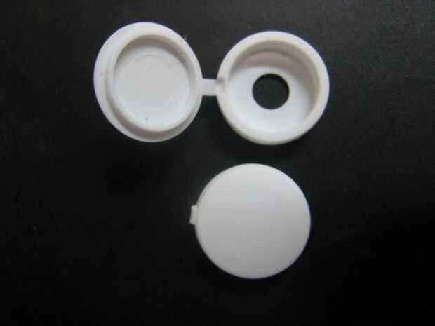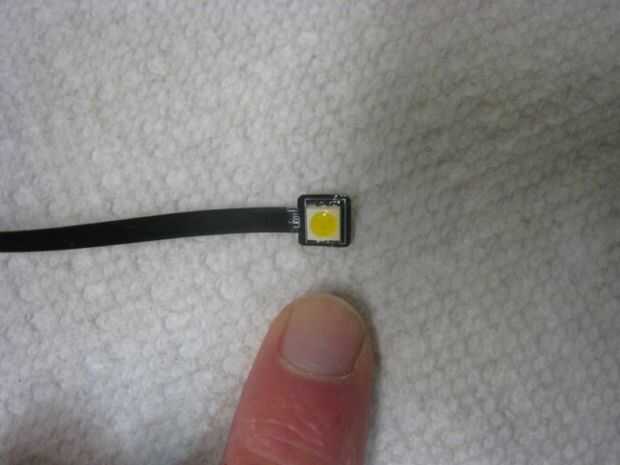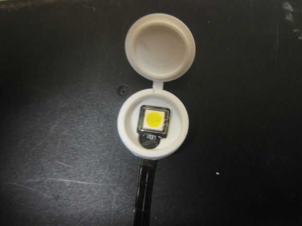 Buscando por los cajones de hardware especializados en mi local Lowe, decidí que sería una cubierta de tornillo redondo, con bisagras, lo podría utilizar para incluir un pequeño LED. Encontré un LED en Superbrightleds.com. El pequeño punto SMD LED pequeña y plana era justo lo que necesitaba. La cubierta del tornillo necesita sólo una ligera modificación para permitir centrar el LED. Aunque el pequeño punto tenía una espalda pegajosa, agregué algunos pegamento caliente sólo para asegurarse de que permanecía en el lugar.