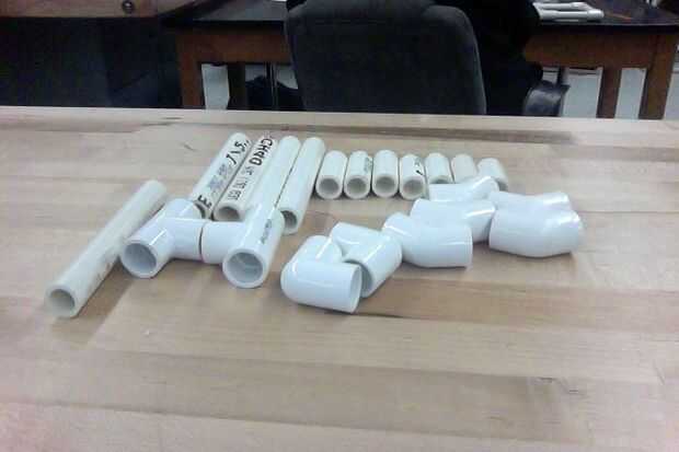 se reúnen materiales que son 2 conectores de 45 grados, 1 conector de 90 grados y 12 en tubo de pvcPaso 1: Corte pulgadas dos 1 piezas del pie del pvc y divide las restantes 10 pulgadas por la mitad. Que le da dos de 1 pulgada y dos 5 pulgadas piezas