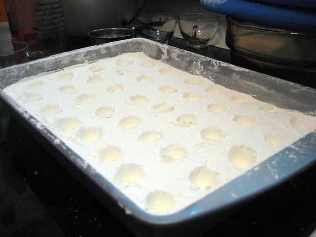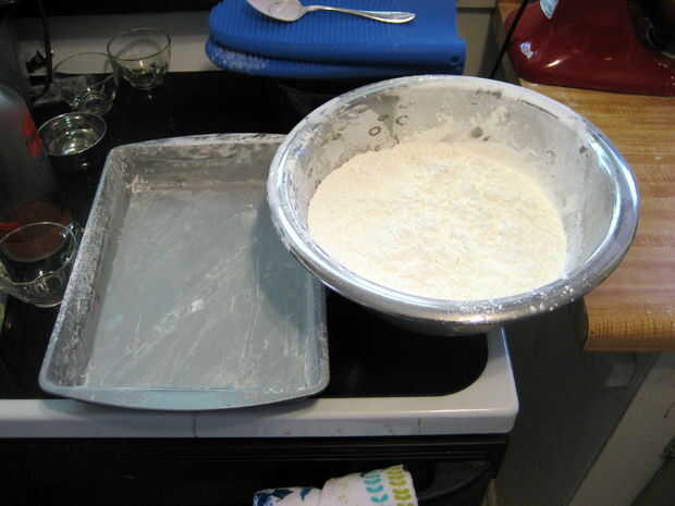 Una vez que ha secado el almidón, tamizar de los tazones de fuente en los platos para hornear. Objetivo de una capa de 1 1/4 pulgada de profundidad. Necesita conservar un buen poco de almidón para más tarde - no se olvide que, como siempre hago.