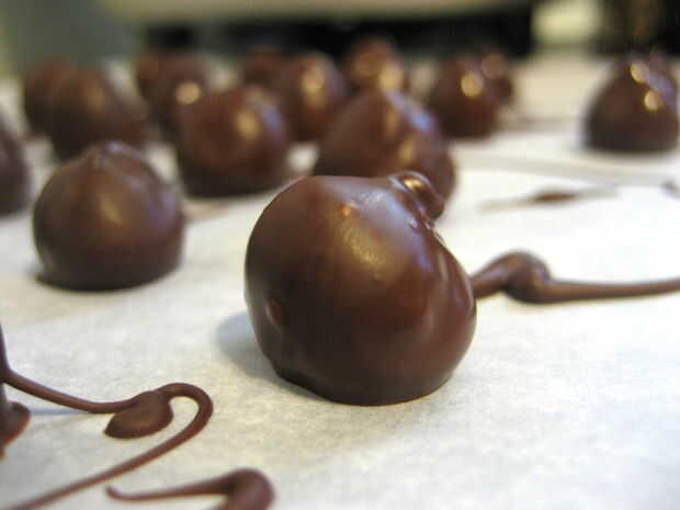 Capa, sólo deje caer el caramelo en el chocolate el movimiento él alrededor con un tenedor para cubrir. Saque el chocolate con la misma horquilla, luego toque y raspar el recipiente para quitar el chocolate sobrante. Deje que el caramelo caiga de la horquilla suavemente sobre el papel de pergamino se enfríe.