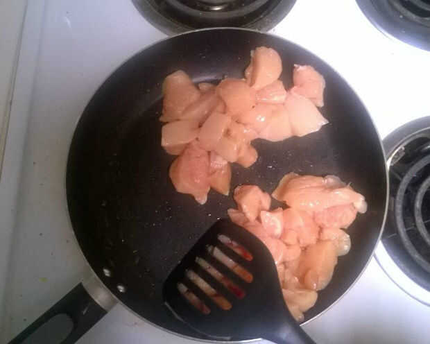 Vierta una cantidad de dólares la mitad de tamaño de aceite de canola en la sartén antes de añadir los trozos de pollo. Revuelva el pollo para que la mayoría de las piezas tienen poco de aceite en la parte inferior de ellos. Gire la parte superior de la estufa en el ajuste más alto y se deja cocinar.