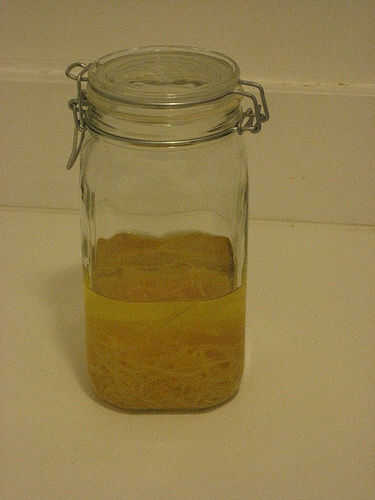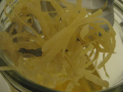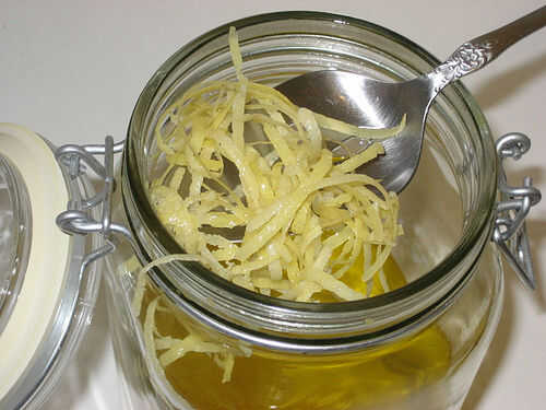 OK! Ha sido un mes o así, y el alcohol ha tomado un color amarillo muy brillante. Esto es sólo lo que queremos, nos muestra que los aceites de limón la ralladura a la izquierda y entró en el líquido. Ahora es el momento para sacar la ralladura de limón. Si se hace, el alcohol debe ser limón y la ralladura muy pálida y algo más frágil. Se trata de derecho.