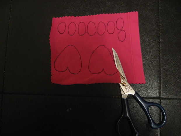 Con la tela rosa corte 8 óvalos y en forma de cojines de corazón 2. Hacer el fondo de los corazones redondos no puntiagudos.