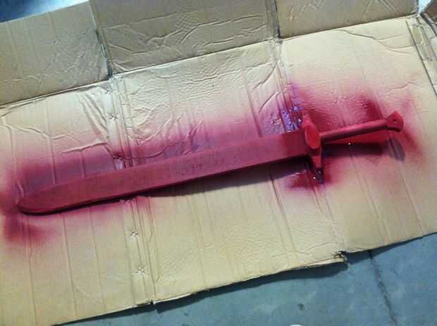 Después de seca la imprimación le di dos capas de una pintura en aerosol plata martillada. No quiero el efecto martillado pero estaba tratando de encontrar una pintura que le daría la apariencia de metal sin esa mancha metálica, porque nunca he visto una espada con fleck metálico en ella. Si usted rocía ligeramente realmente realmente puede evitar el look "martillado".