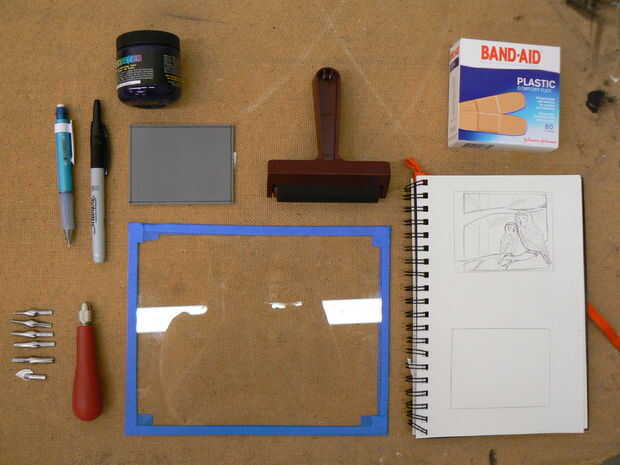 No insisto en esta suficiente. Si es tu primera vez haciendo un linóleo cortado, sugiero altamente que tener a mano una caja de curitas. No está en peligro de cortar un dedo haciendo un linoprint, pero no importa cómo cuidadosos soy, siempre llego a cortar un dedo o dos. Un ungüento antiséptico es una buena idea también!