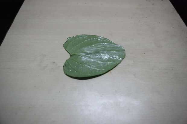 Aplicar la Chuna en la hoja con la ayuda de un palo o del dorso de una cuchara sobre una hoja del betel húmedo lavado.