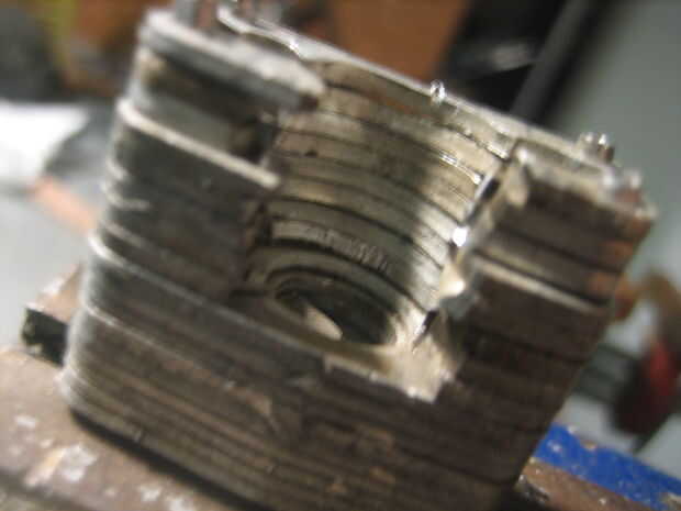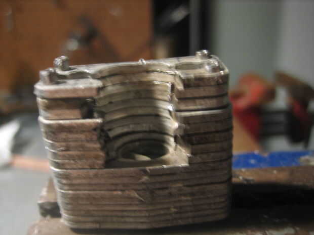 Una vez que tengas todas las placas cortarlas puesto detrás en el orden llevó. Tienen que ser la fuerza en que uso un martillo y cabeza plana para les cincel de nuevo. Una vez que los tengas todos en se puede utilizar una dremel para incluso los cortes hacia fuera pero me gustaría dejarlo como esta ya que tiene un tema detallado