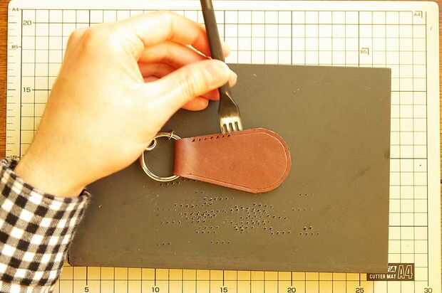 Golpeó la cabeza de la horquilla con el uso de martillo de madera y hacer agujeros en el cuero.