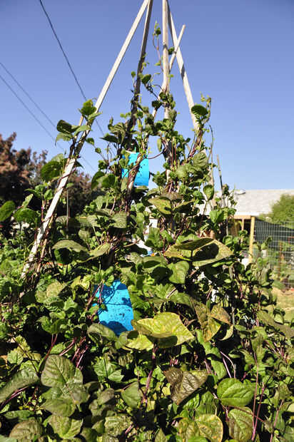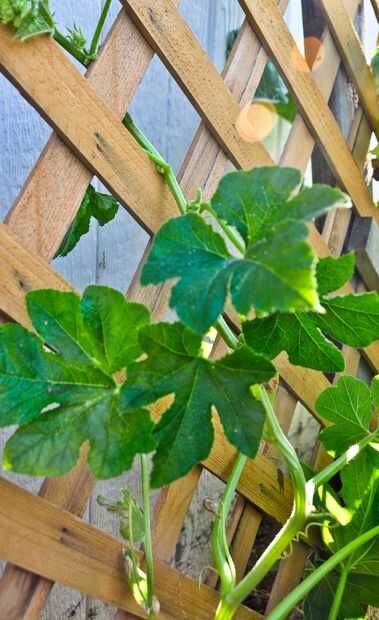 Plantar variedades de calabaza, frijol y pepino eso vid (no variedades de arbusto). Instalación de éstos en un enrejado (en el caso de cukes y calabazas) o, en el caso de poste de frijoles, encima de un tipi de frijol. Un tipi puede hacerse de cualquier polos largos y delgados (utilicé listones encontradas en mi garaje y atadas con tiras de zip). Para poste de habas, el tipi debe ser al menos 5' de altura. Puede utilizar esgrima como un enrejado, ya sea cadena, alambre de pollo, alambre soldador o lo que tengas. Las plantas que tenga un poco de ayuda para saber por dónde crecer, asegúrese de tratarlos con cuidado para no romper los tallos.