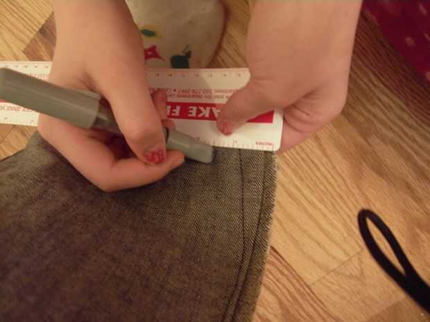 Primera vez los jeans al revés Luego medir cuantas pulgadas desea tomar de cada lado y marcar con un rotulador o una herramienta de marcado. Marque otra vez donde quieres hacerlo comienza a recibir más (en algún lugar alrededor de la rodilla)