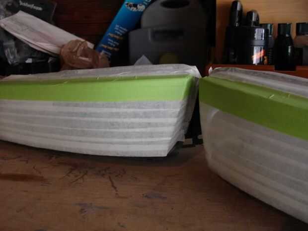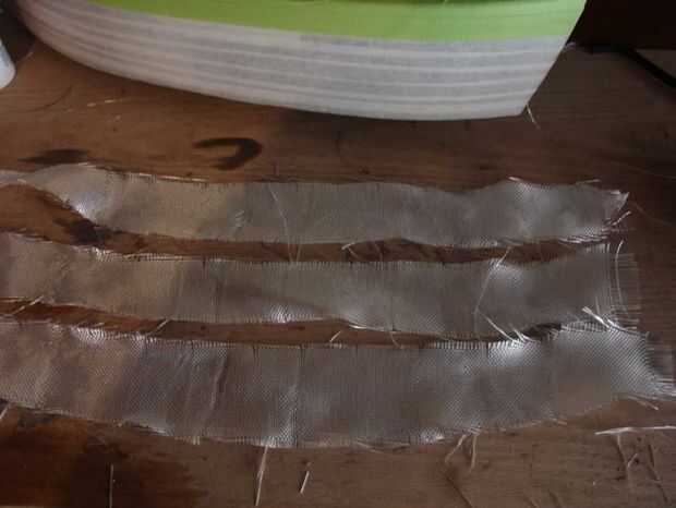 Esto es donde también corté mi estera de fibra de vidrio en tiras que son lo suficientemente grandes para adaptarse un poco a mi cinta de la verde (línea guía). Debe utilizar al menos 3-4 capas para cada faro.
